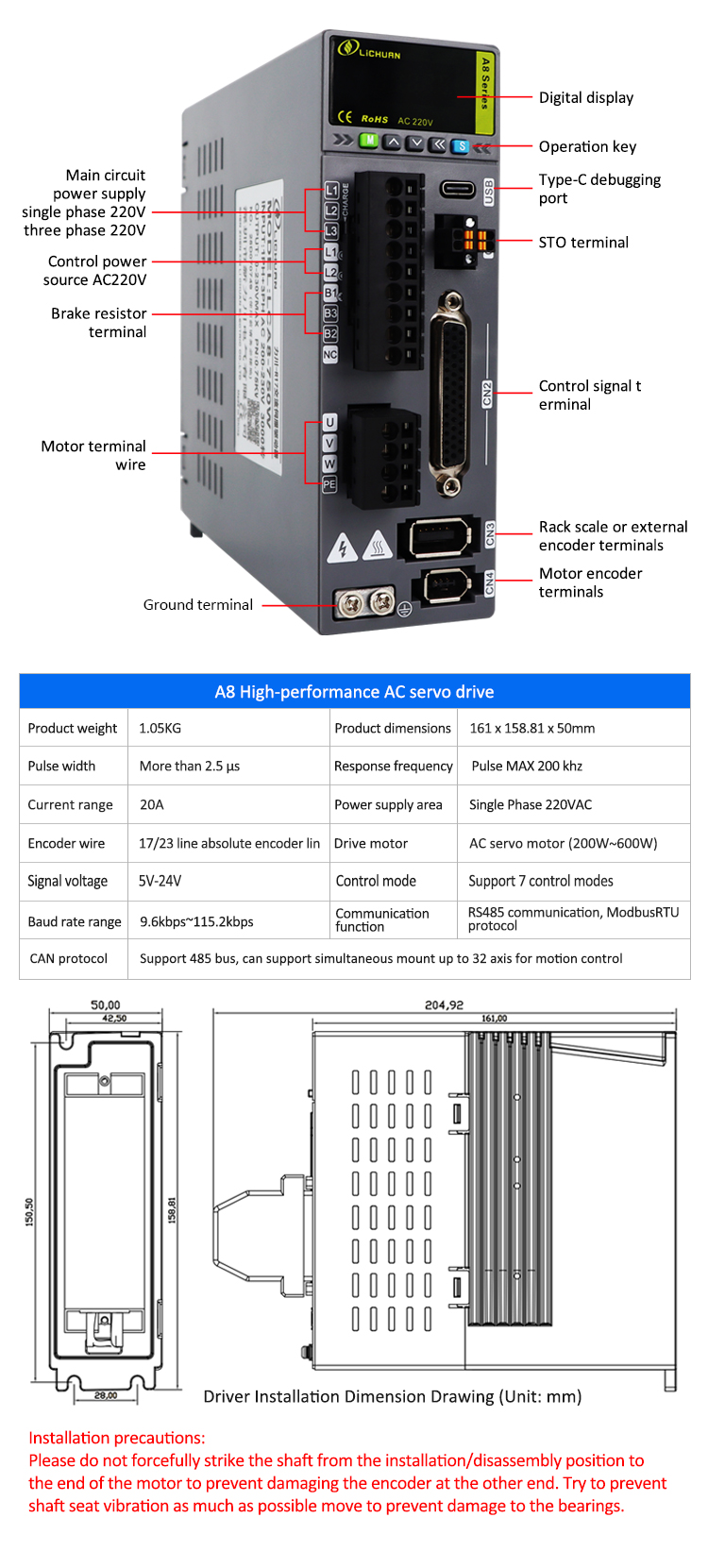 Ta serija je visoko zmogljiv AC servo pogon z vgrajeno funkcijo varnostnega izklopa navora STO (Safe Torque Off), ki je v skladu z varnostnim standardom IEC 61800-5-2 in omogoča varno zaustavitev v nujnih primerih. Sistem podpira krmilni način s popolno zaprto zanko in dosega natančnost pozicioniranja ± enega impulza prek povratne informacije kodirnika visoke ločljivosti, ki je združljiva z vrtljivimi motorji in scenariji uporabe linearnih motorjev. Opremljen je z vmesnikom za odpravljanje napak Type-C, podpira konfiguracijo parametrov v realnem času in ima vgrajen komunikacijski vmesnik RS485 (protokol Modbus RTU), hitrost prenosa pa je mogoče prilagoditi od 9,6 kbps ~ 115,2 kbps. Sprejema algoritem za nadzor usmerjenosti magnetnega polja (FOC), ki je primeren za primere z visoko dinamičnim odzivom, kot je natančna CNC in polprevodniška oprema.